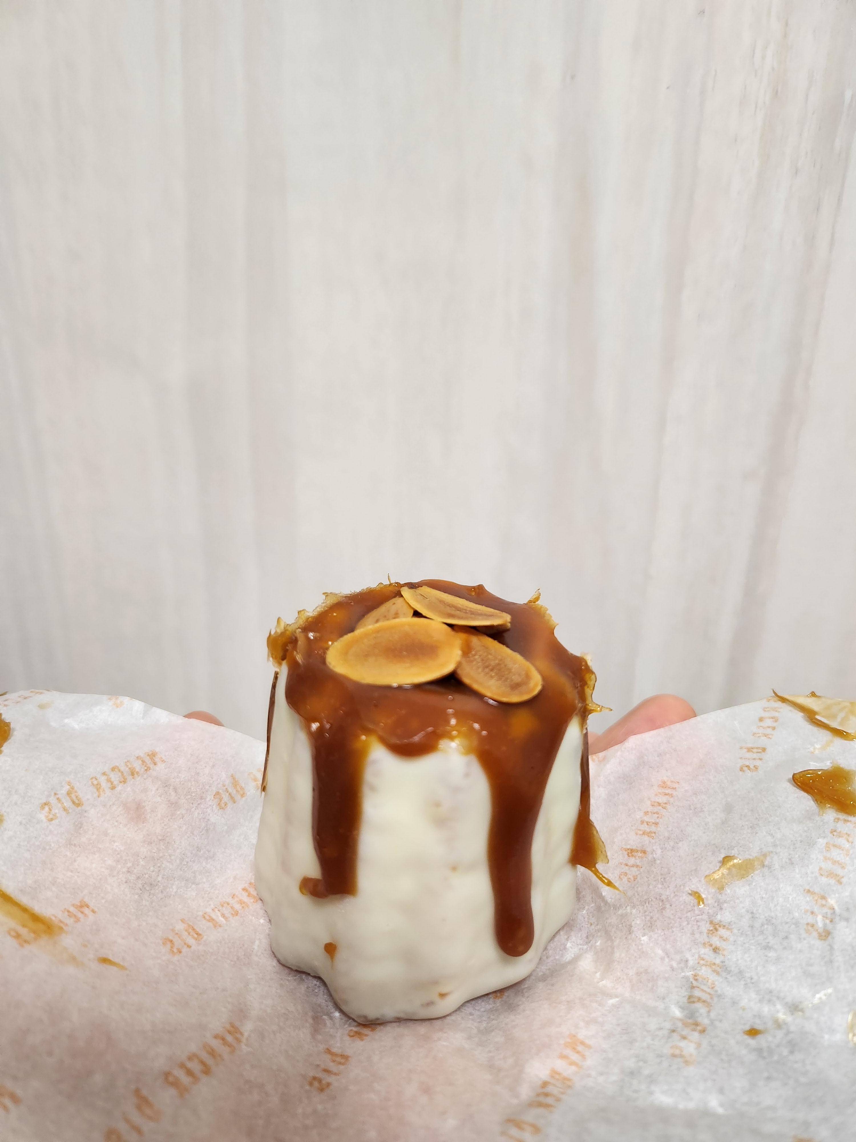 안은 까눌레모양의(까눌레 참 좋아하는 듯) 시폰케이크고 그 위에 초코 코팅이 되어 있으며 그 위로 캐러멜소스가 얹어져 있다!