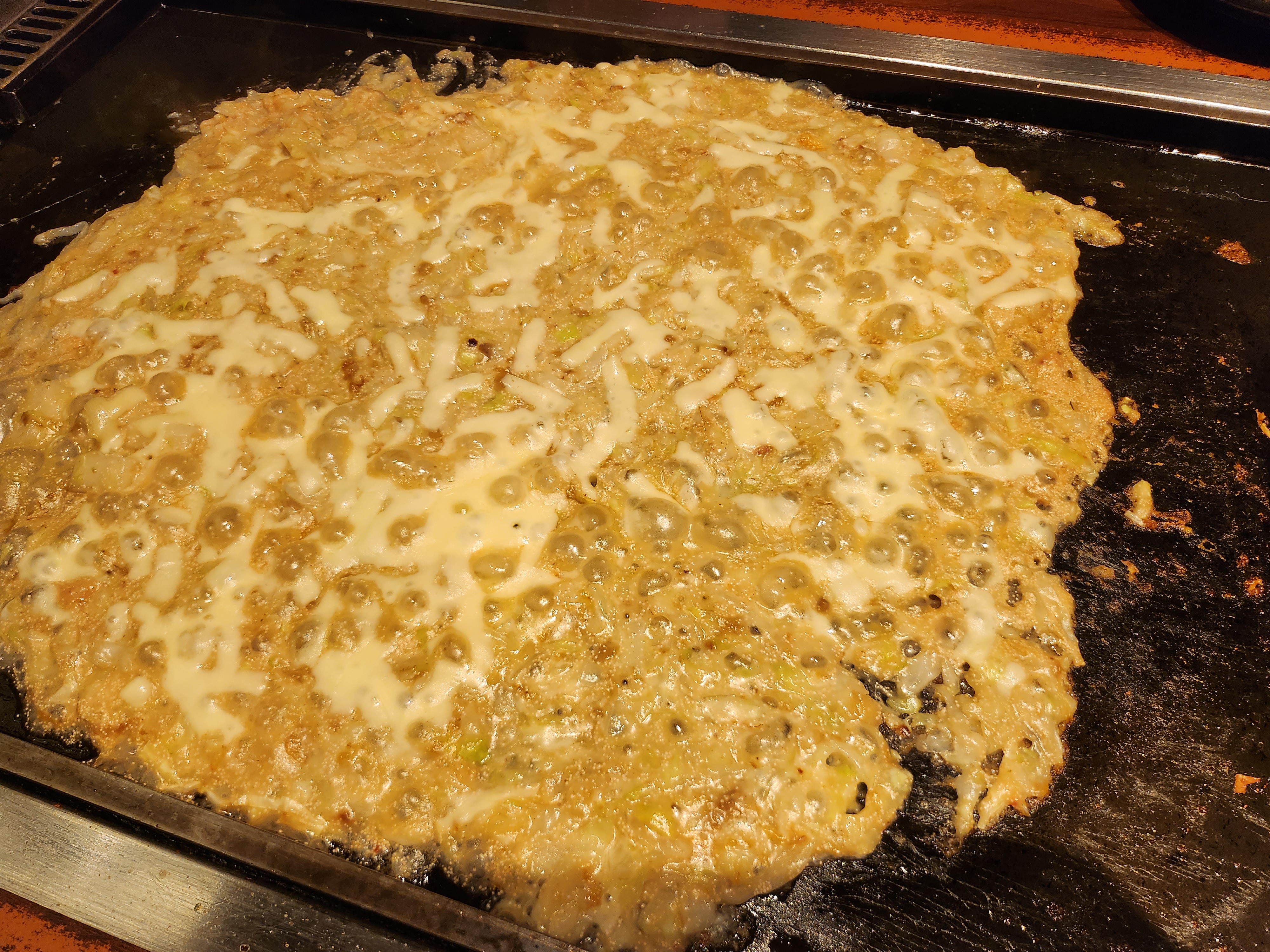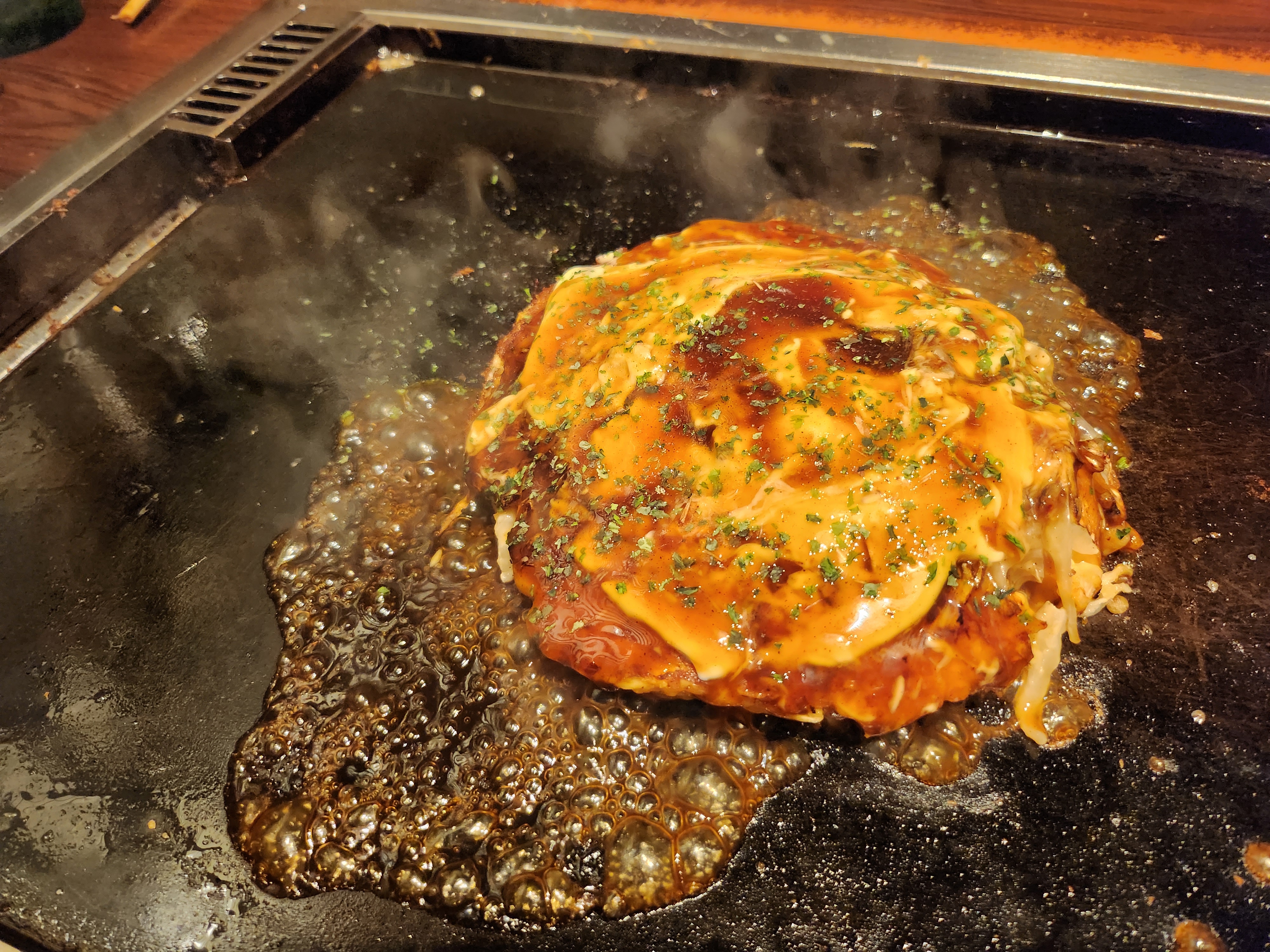 뭐랄까 그냥 적당한 오꼬노미야끼집을 가면 밀가루반죽의 양을 많이 해서 굽는 느낌인데 여기는 그렇지 않았고 최소한의 반죽과 계란으로 적당히 잘 익혀서 만드는 느낌이었다!