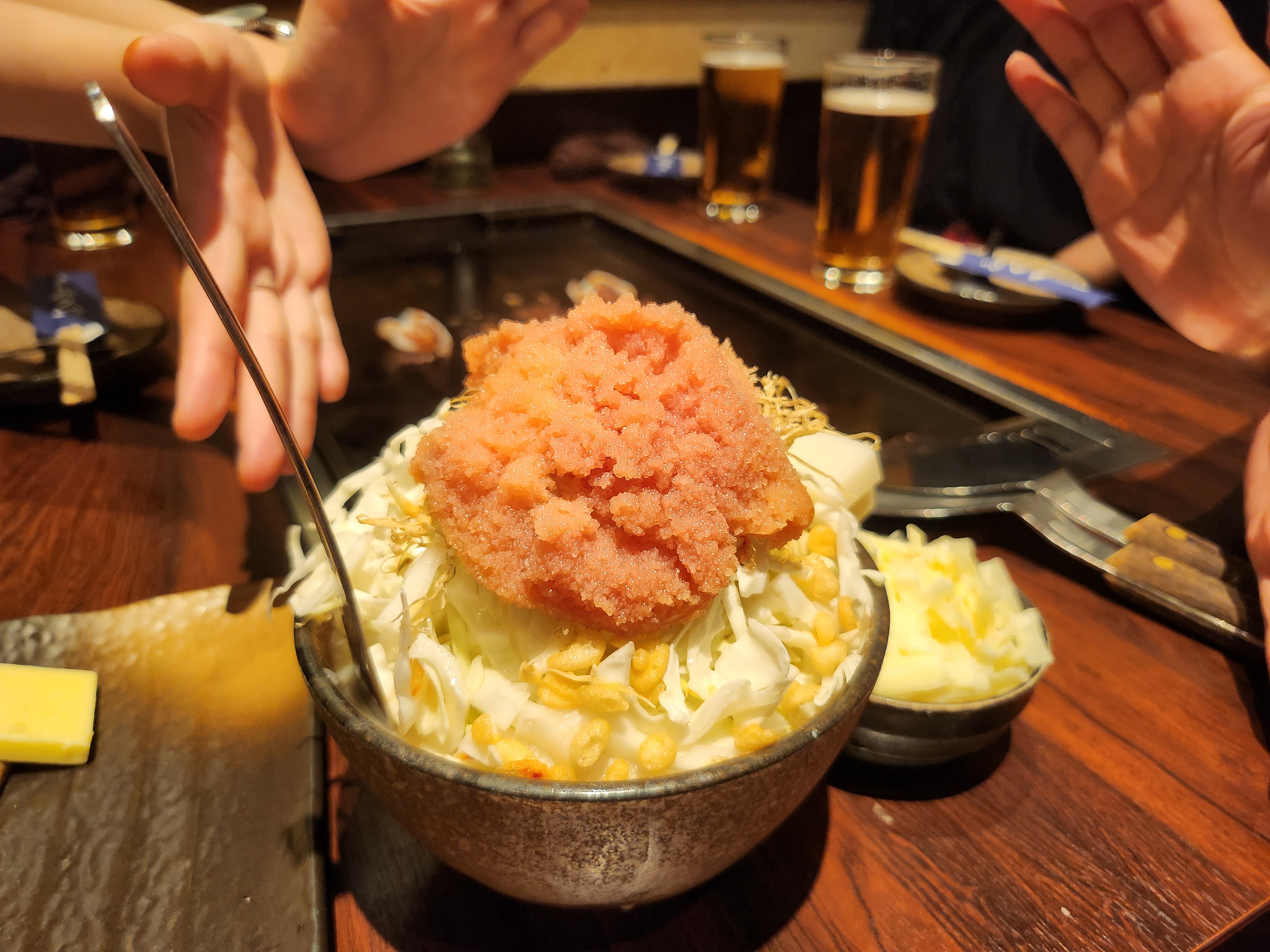 멘타이코모치몬자(명란젓 떡 몬자야끼)에 치즈 추가! 직원분이 추천해 주셨고 이 가게의 넘버원 메뉴이기도 했다.