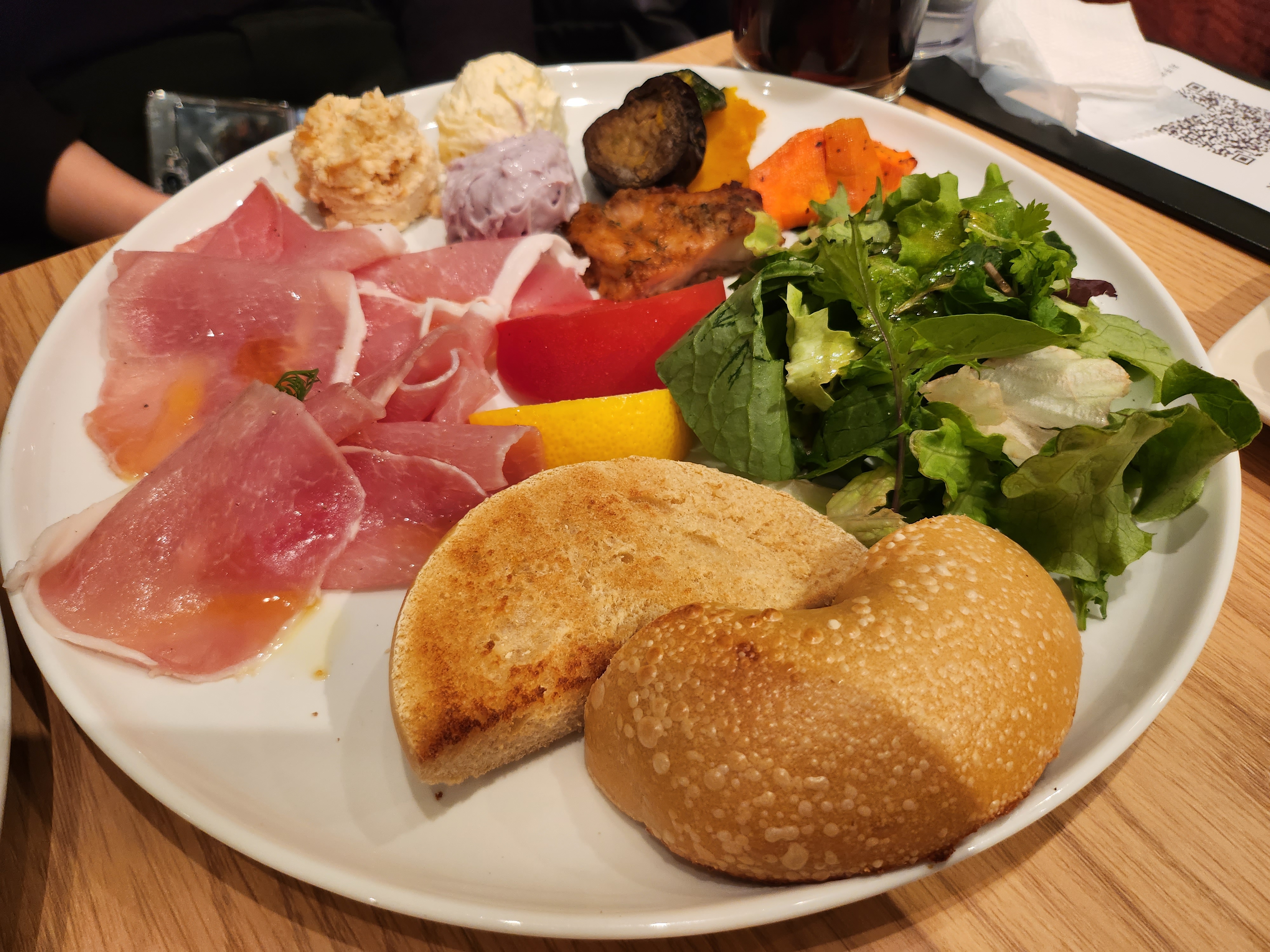 플레이트는 베이글 반조각, 생햄(or 연어), 크림치즈 세 가지, 탄두리 치킨, 구운 야채들, 샐러드로 구성되어 있다.